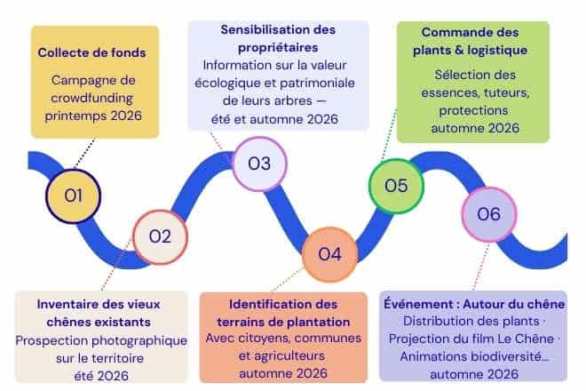 Ce projet s’articule autour de trois actions complémentaires : planter de jeunes chênes sur des terrains identifiés avec les acteurs locaux, valoriser les vieux chênes existants dont la richesse écologique est souvent méconnue, et sensibiliser citoyens et propriétaires à la biodiversité exceptionnelle de cet arbre.